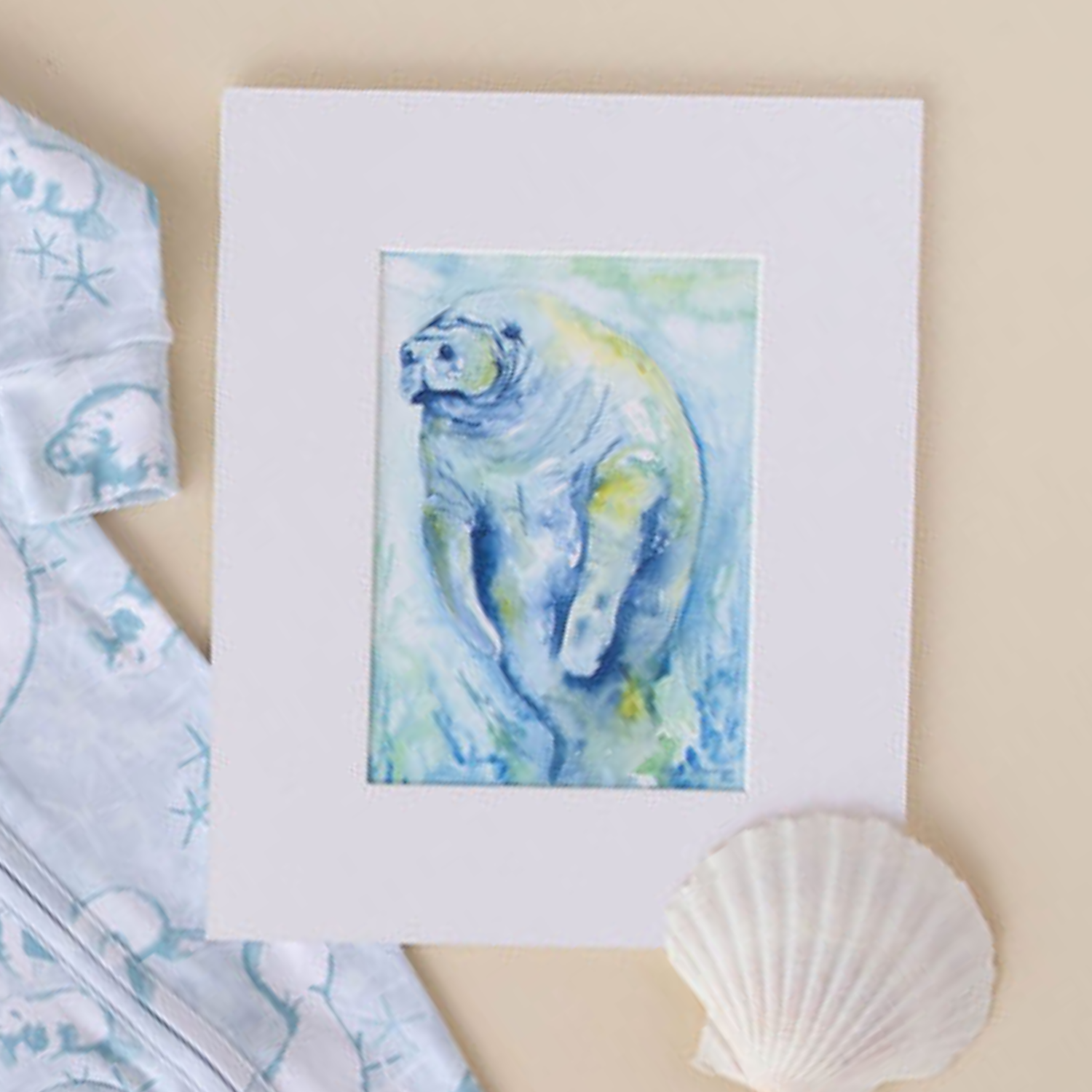 Gentle Drifter celebrates the peaceful presence of the manatee. A soft, soulful reminder to slow down and savor love. Perfect for framing above the crib or gifting alongside our First Drift pieces.