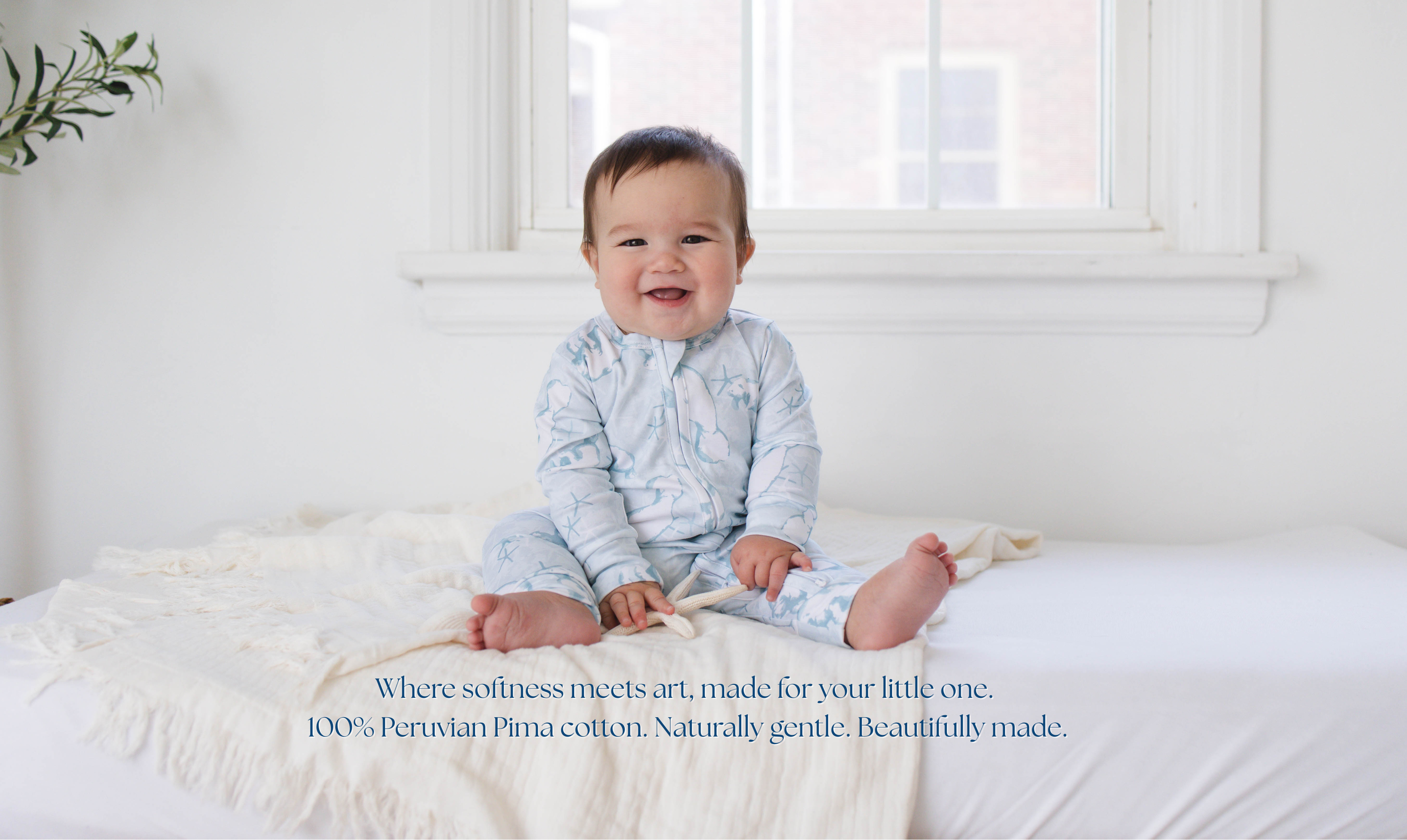 Our debut capsule brings Heidi Stavinga’s original coastal artwork to luxuriously soft Peruvian Pima cotton babywear. Created with love for memories that last.